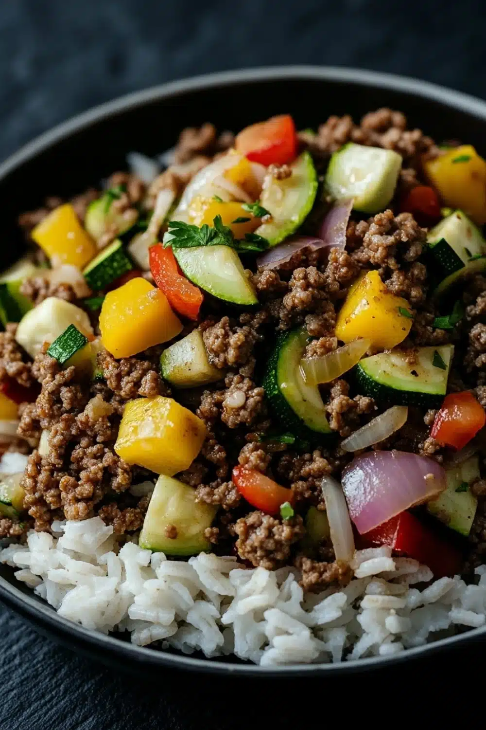 A hearty and flavorful gluten-free ground beef dinner featuring seasoned ground beef with vegetables and rice. Perfect for a quick and satisfying meal.