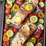 A simple and healthy sheet pan dinner featuring tender salmon fillets roasted alongside colorful mixed vegetables, all seasoned with garlic and herbs for a delicious one-pan meal.