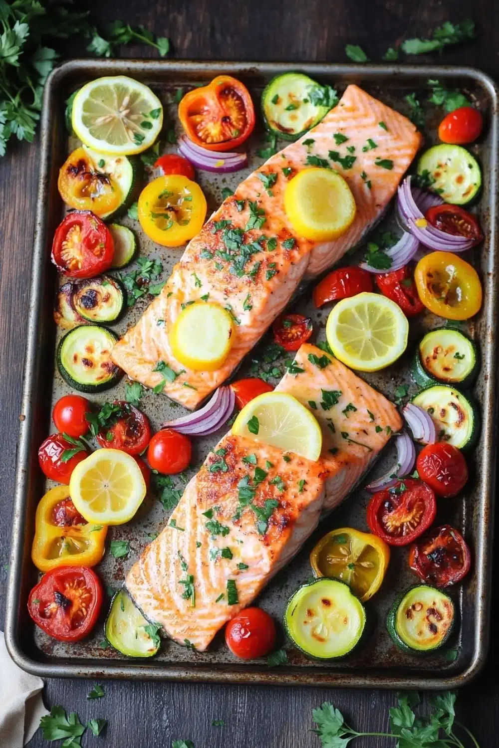 It’s totally fine if you adjust the veggies depending on what’s in your fridge; I usually swap in whatever’s seasonal. The key is just getting that balance of tender-roasted vegetables and perfectly cooked salmon. You’re in control of how garlicky or herby it gets, so it’s easy to make it just right for you.