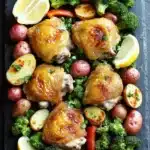 A simple and delicious sheet pan chicken dinner featuring juicy roasted chicken thighs with crispy skin, tender potatoes, and vibrant vegetables all cooked together for an easy one-pan meal.