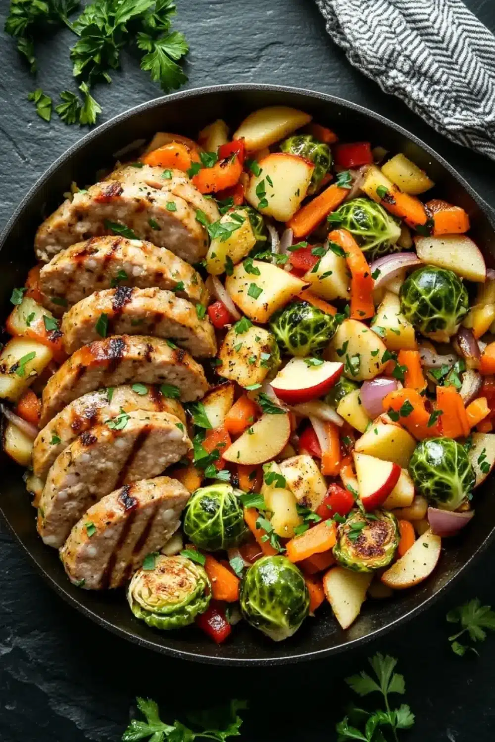 A hearty and flavorful skillet dish featuring savory apple chicken sausage, tender roasted vegetables, and a touch of autumn sweetness. Perfect for a quick and satisfying weeknight meal.
