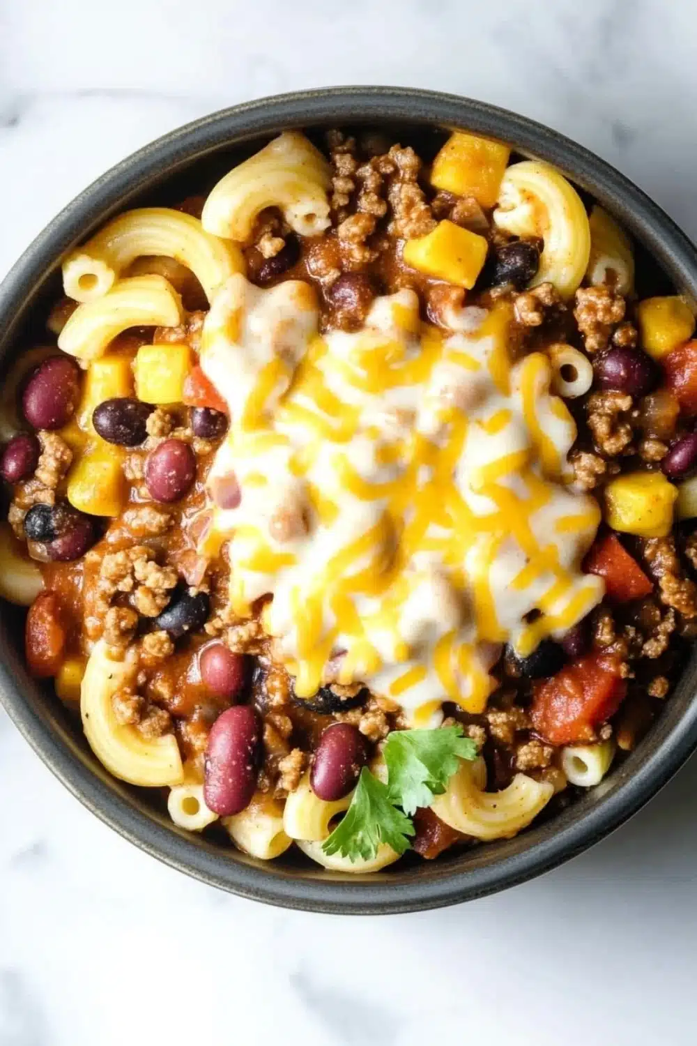 Kitchen Notes: I usually use whatever elbow macaroni I have on hand, and sometimes I swap sharp cheddar for a milder cheese — it works, but the sharpness really balances the chili spices. If you want to change things up, try adding a little corn or swapping the ground beef for turkey, though I haven’t tested those variations extensively. Also, if you like a bit of heat, a pinch of cayenne can do wonders, but start small unless you’re sure you want it spicy. Serving it with a dollop of sour cream or a sprinkle of green onions adds a fresh contrast that brightens up the dish.
