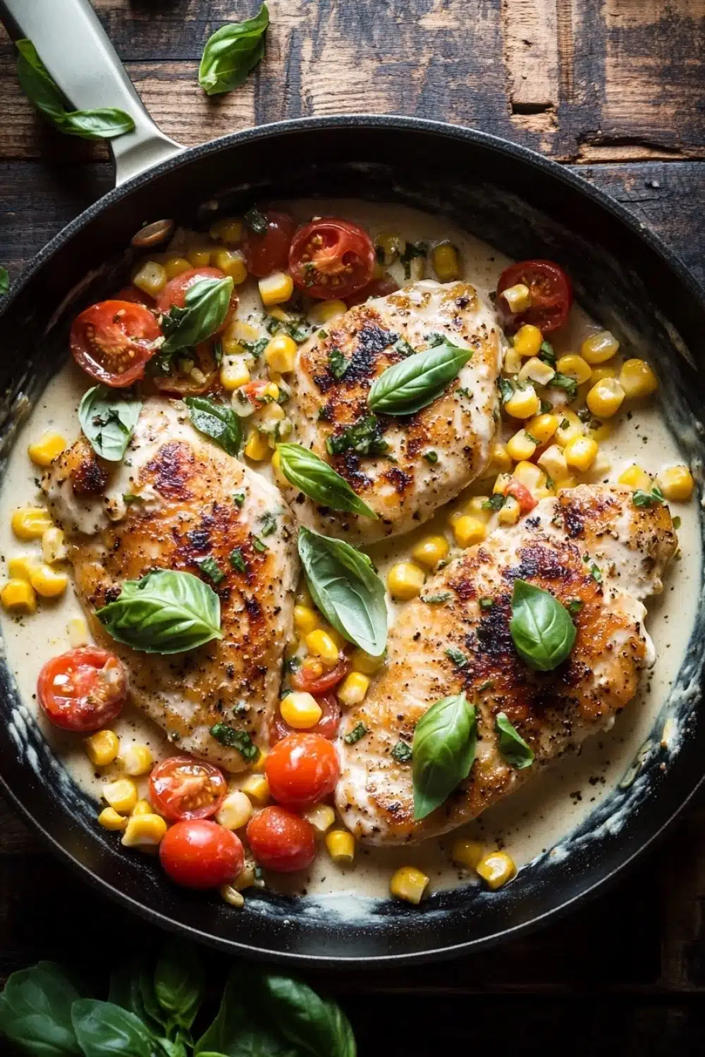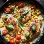 A delicious one-pan meal featuring tender chicken breasts cooked in a creamy basil sauce with sweet corn and fresh tomatoes. Perfect for a quick and flavorful dinner.