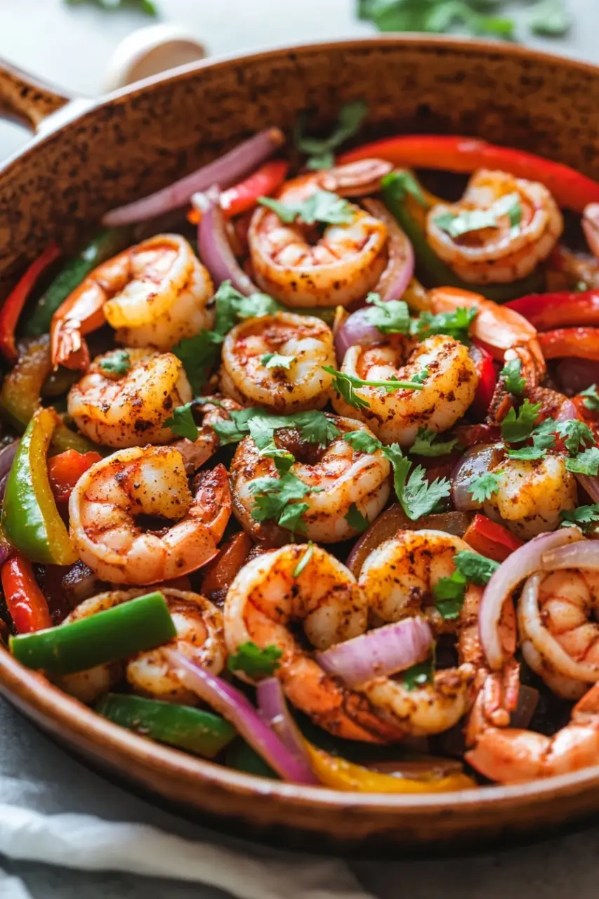 A flavorful and spicy jerk shrimp skillet cooked with bell peppers and onions, perfect for a quick and delicious weeknight meal.