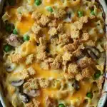Let’s get into the nitty-gritty—why does this casserole work the way it does? Egg noodles provide a sturdy base, with their porous texture soaking up the creamy mushroom soup mixture, which acts as the glue that holds everything together. The condensed soup isn’t just for creaminess; it’s a flavor bomb loaded with salt, fat, and savory mushroom essence, creating that nostalgic mouthfeel many crave. When you add milk, it thins the soup just enough, preventing dryness without turning the casserole soupy. The sautéed onions and mushrooms release moisture and deepen flavor through the Maillard reaction—this browning process adds complexity beyond the canned soup. Meanwhile, the peas burst with a pop of sweetness, cutting through the richness. The breadcrumb topping—well, that’s science too. Coated in melted butter, these crumbs crisp up in the oven, creating a textural counterpoint to the creamy interior. This contrast is what makes the last bite so damned satisfying. In short, the casserole is a balancing act between moisture, texture, and flavor layers.