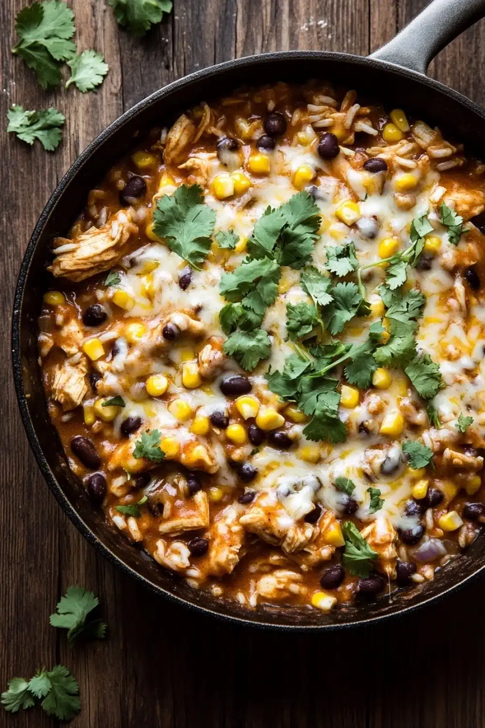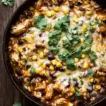 A quick and easy one pot chicken enchilada skillet packed with tender chicken, black beans, corn, and a flavorful enchilada sauce, topped with melted cheese and fresh cilantro. Perfect for a weeknight dinner!