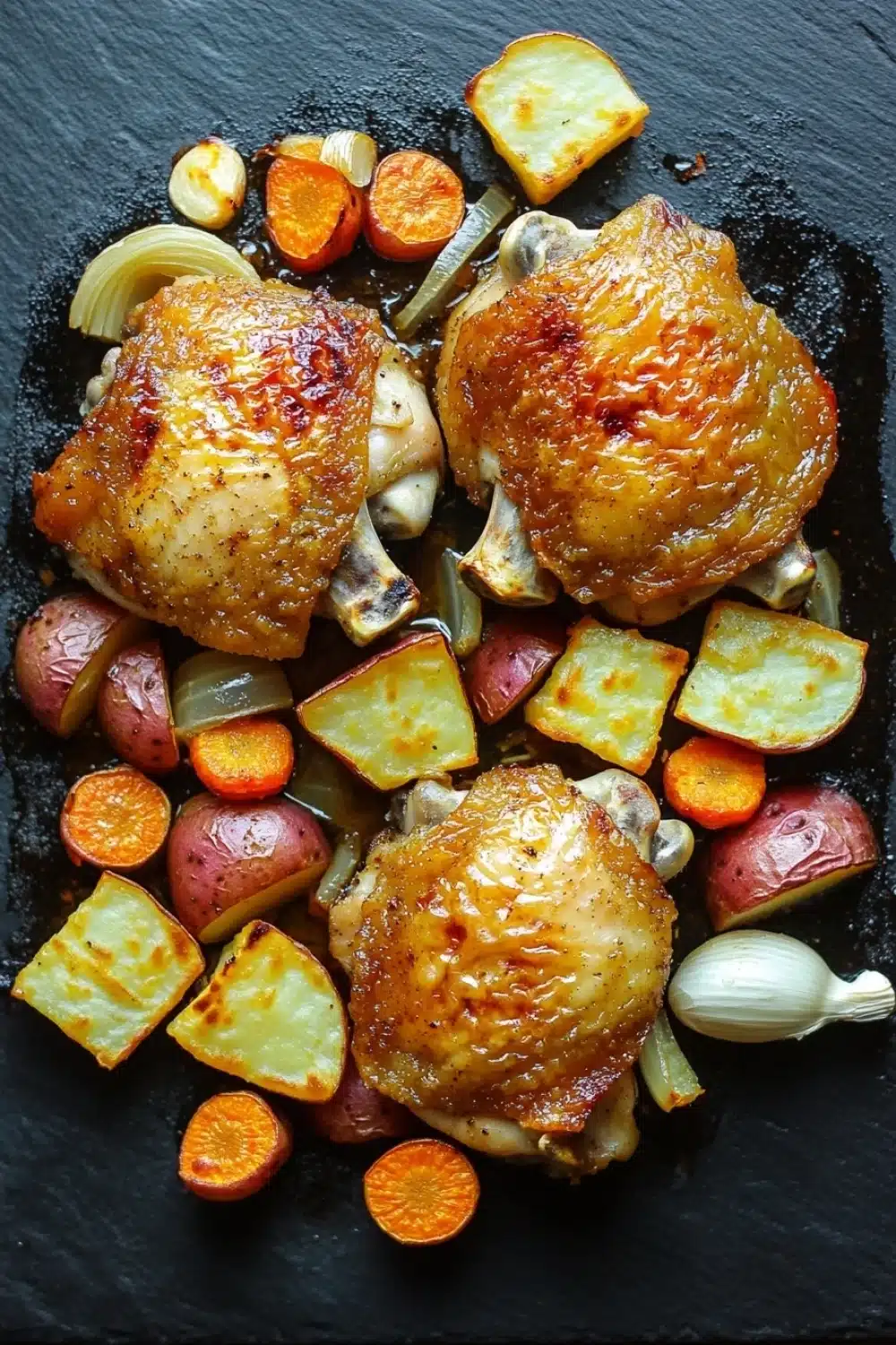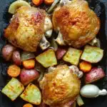One evening, I remember juggling between finishing work emails and prepping dinner, only to realize I had about 10 minutes before hunger became a real distraction. I grabbed the chicken thighs, tossed them with some herbs, and threw everything into a single pot. While the oven did its work, I caught a glimpse of that golden skin browning through the lid and the smell of garlic and rosemary filling the kitchen. The clock ticked down, and just as I was about to lose track of time, dinner was ready—crispy on top, tender underneath, and perfectly cozy with those soft roasted carrots and potatoes. It’s the kind of meal that doesn’t ask for extra effort but rewards you with moments to breathe and enjoy.