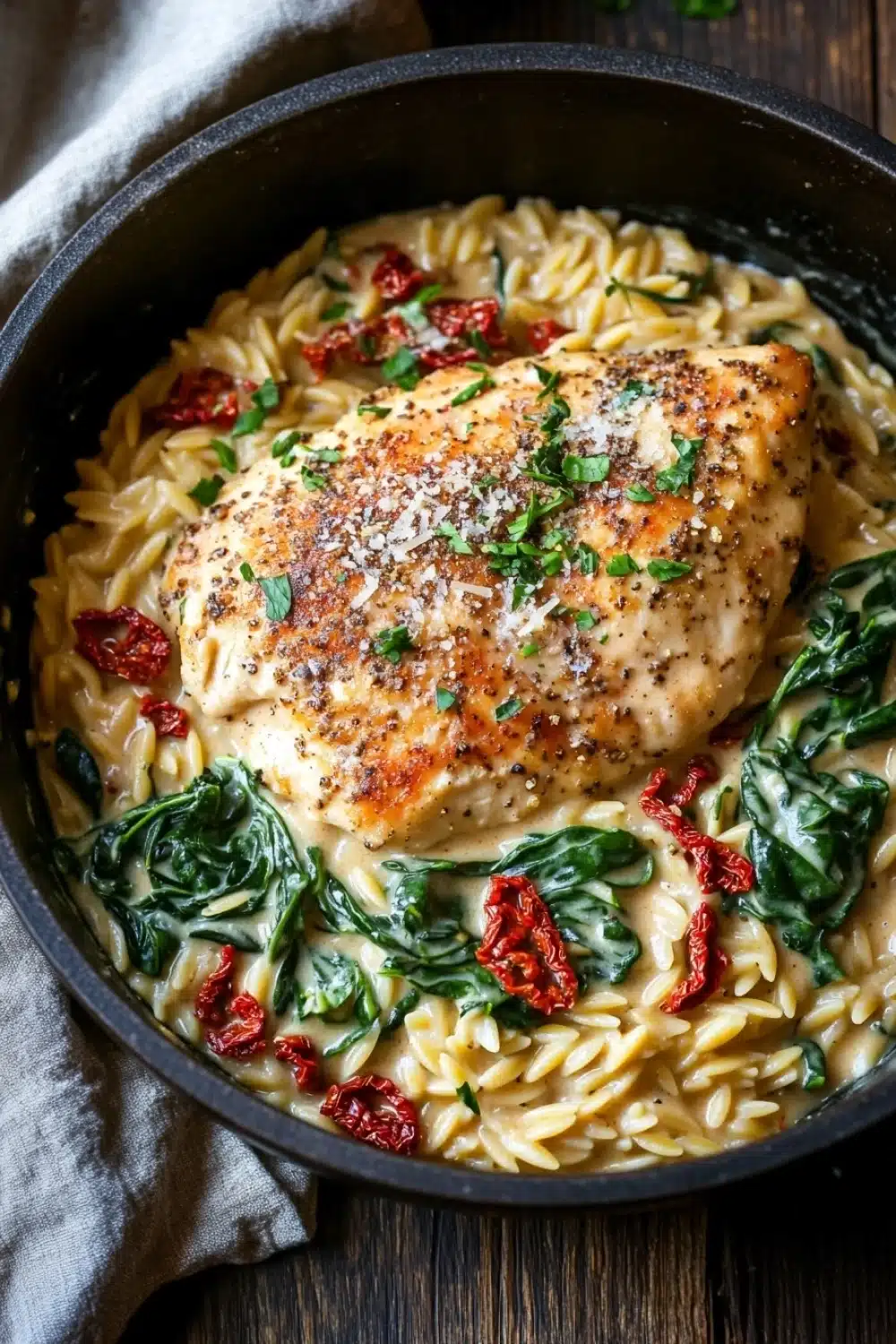 A delicious and easy one-pot meal featuring tender chicken breasts cooked in a creamy Tuscan sauce with spinach, sun-dried tomatoes, and orzo pasta. Perfect for a comforting weeknight dinner.