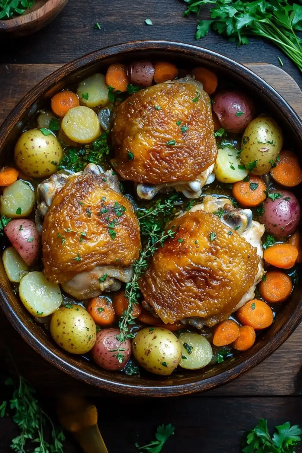 Using a heavy-bottomed pan or Dutch oven makes a difference here, helping with even heat distribution and that coveted golden skin. I like to plate the chicken right on top of the vegetables, letting the juices mingle as you eat. Sometimes I swap baby carrots for parsnips or toss in a handful of green beans near the end for a bit of crunch. And while fresh herbs make the dish sing, dried ones can work in a pinch—just adjust the quantity to your taste.