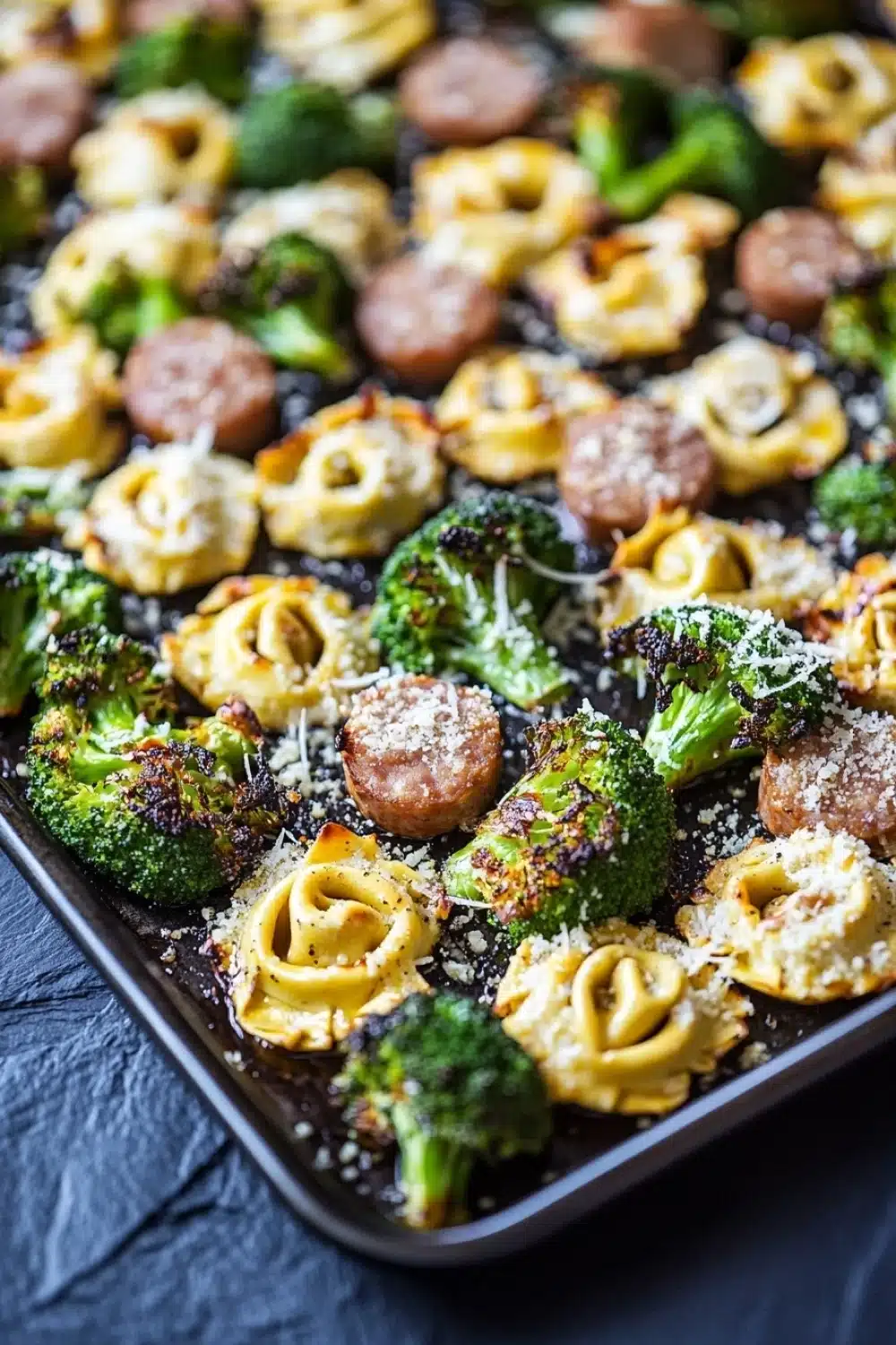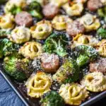 A quick and easy one-pan meal featuring savory Italian sausage, cheese-filled tortellini, and roasted broccoli, all baked together on a sheet pan for a delicious and hassle-free dinner.