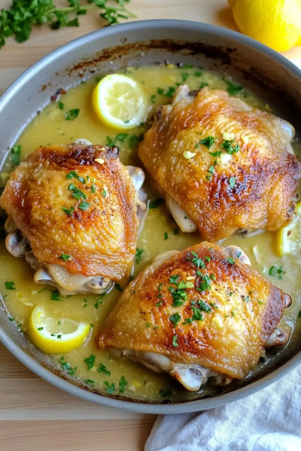Return the chicken thighs to the skillet and spoon the lemon pan sauce over them.