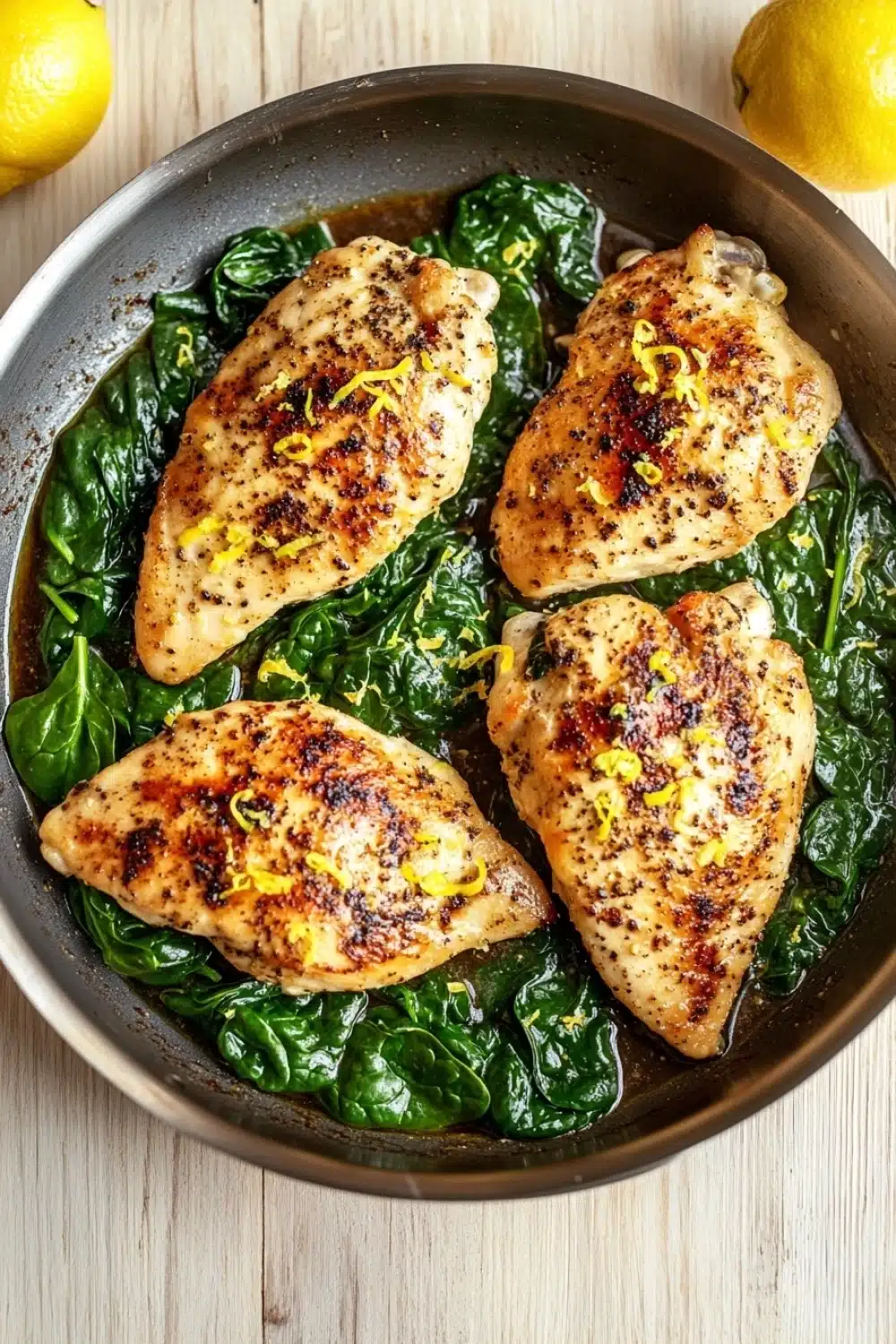 A quick and flavorful one-pan meal featuring tender chicken breasts cooked in a zesty lemon sauce with fresh spinach. Perfect for a healthy weeknight dinner.