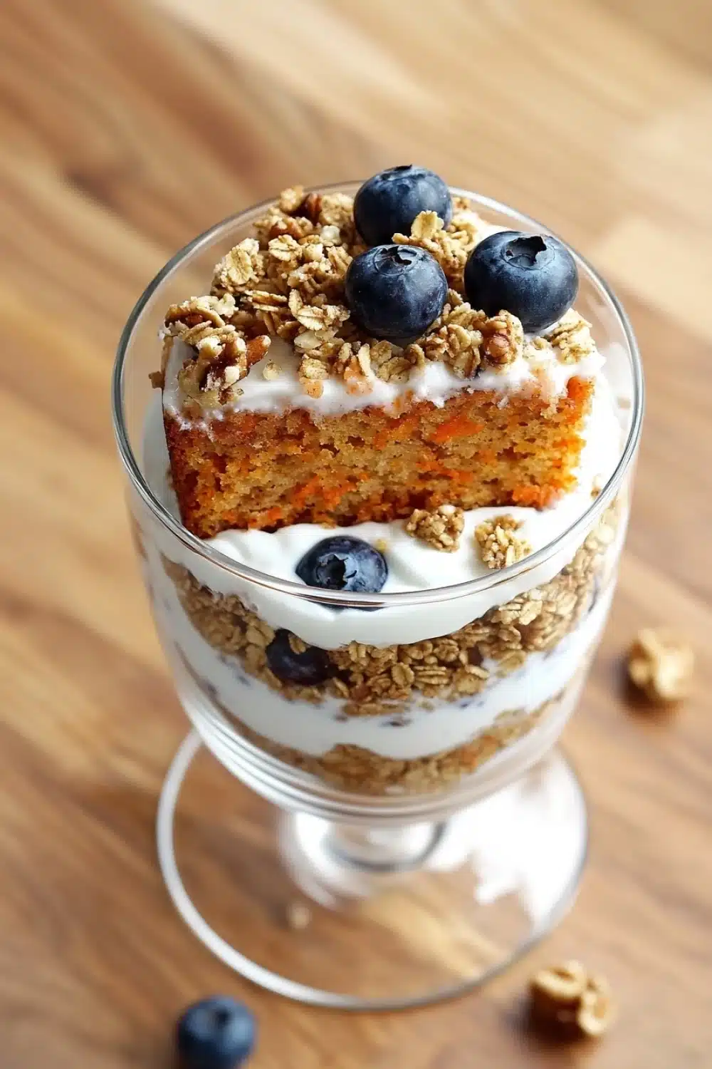In serving glasses or bowls, layer a spoonful of the yogurt mixture, a slice or piece of carrot cake, a sprinkle of granola, and some fresh blueberries.