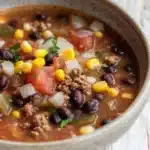 A hearty and flavorful taco soup made with ground beef and a blend of beans, corn, and tomatoes, perfect for freezing and enjoying later. This easy freezer meal is ideal for busy nights and packed with classic taco flavors.