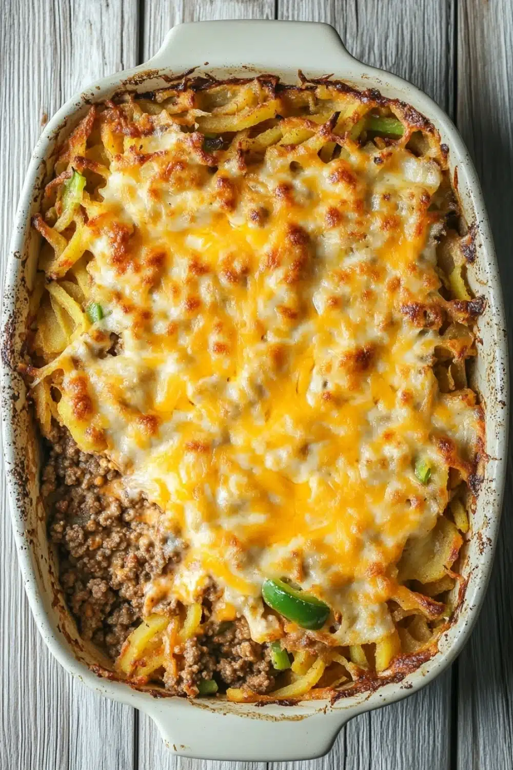 A hearty and comforting beef casserole layered with seasoned ground beef, creamy sauce, and crispy hashbrowns, perfect for a family dinner.