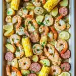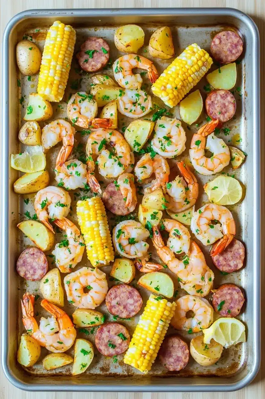 A quick and easy sheet pan shrimp boil cooked in the oven, featuring shrimp, sausage, potatoes, and corn all seasoned with classic Cajun spices for a flavorful and convenient meal.