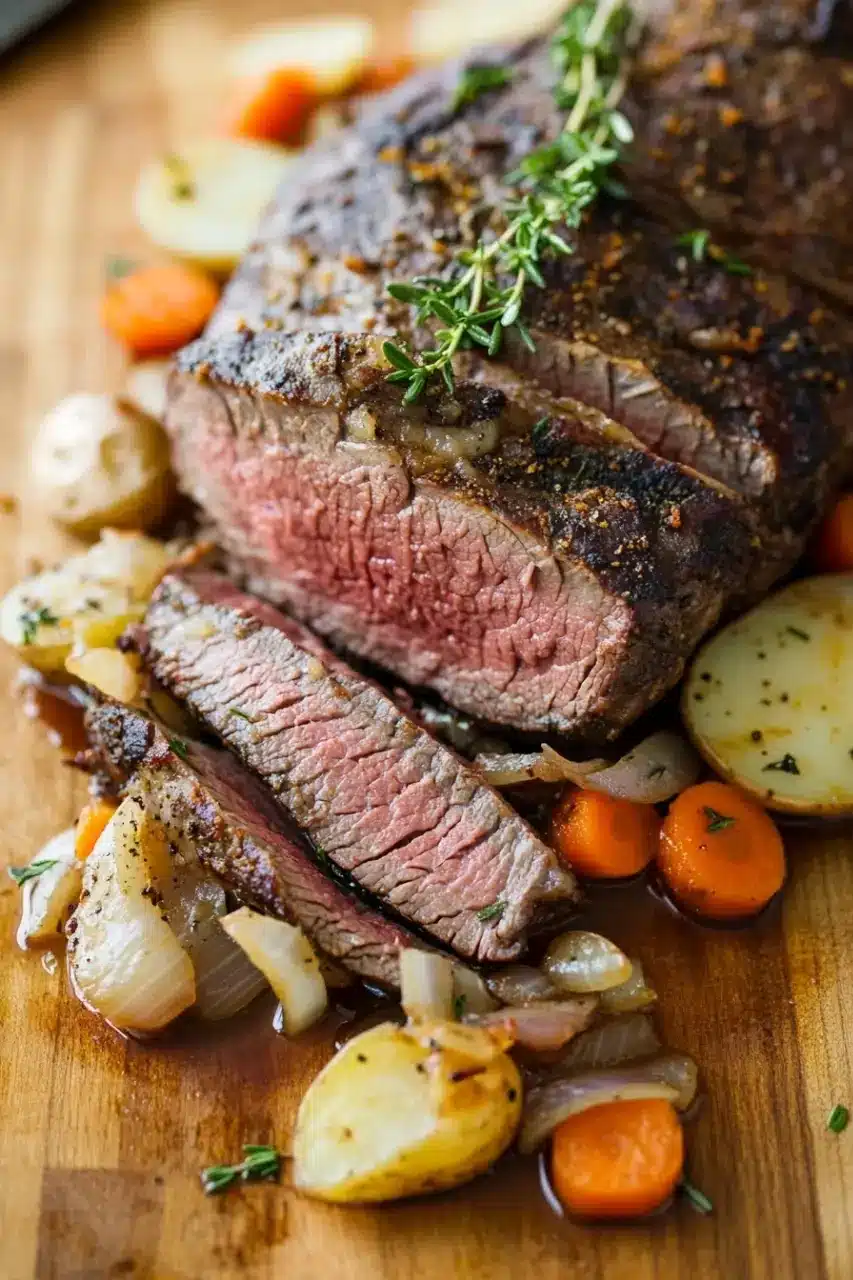 How do I know when it’s done? The roast should reach medium-rare to medium, around 135–145°F, but the crock pot often makes it easy to tell by tenderness alone.