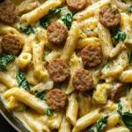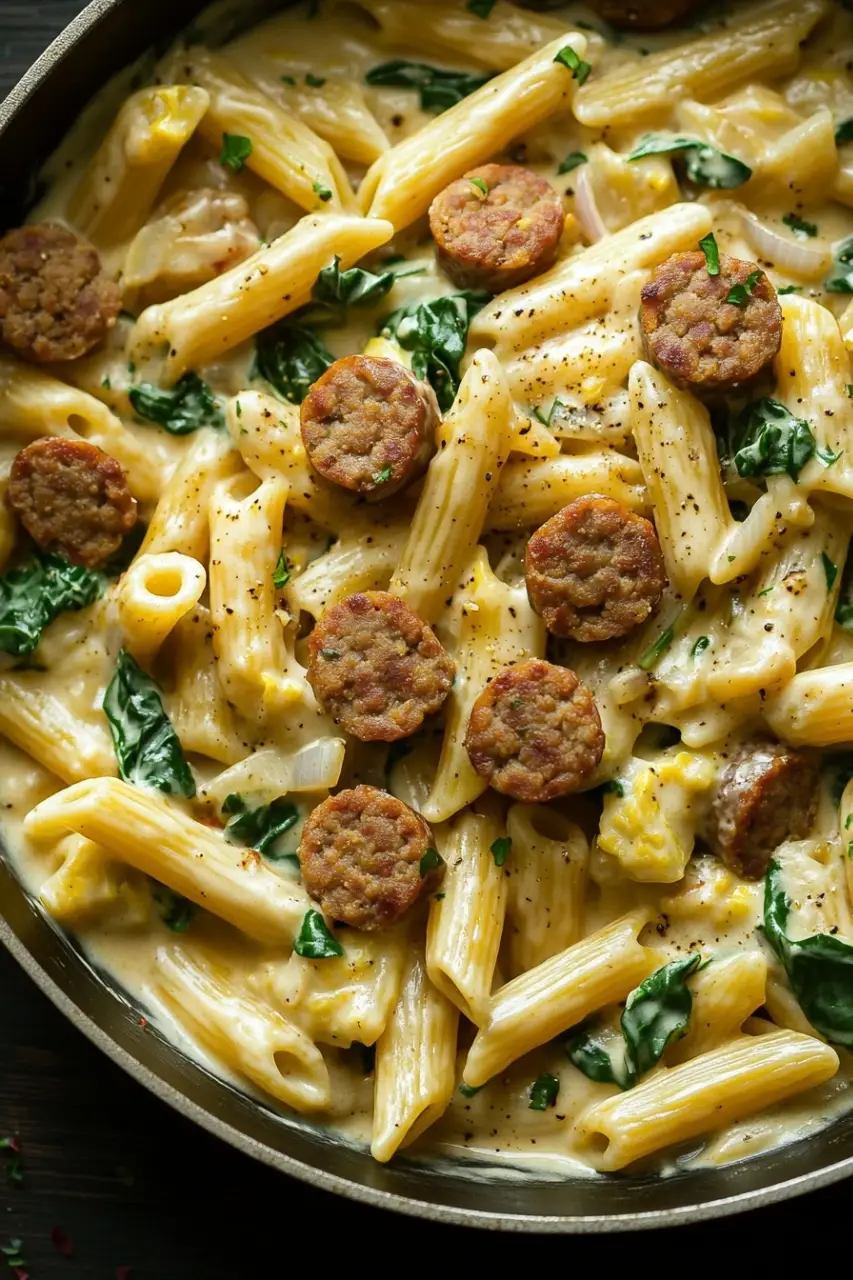 It’s one of those meals that makes you want to curl up with a bowl and forget about the day, but also share it with whoever’s around because it’s just that comforting. The sausage slices browned just right, adding a smoky, savory layer that contrasts beautifully with the velvety cashew-based sauce. I tossed in some wilted spinach at the last minute, which gave it a subtle freshness and a pop of color that made the skillet feel complete.