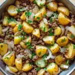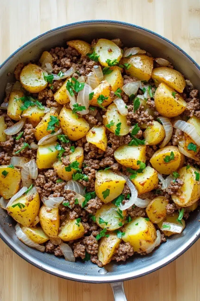A hearty and flavorful one-pan meal featuring seasoned ground beef, tender potatoes, and aromatic onions cooked to perfection in a skillet.