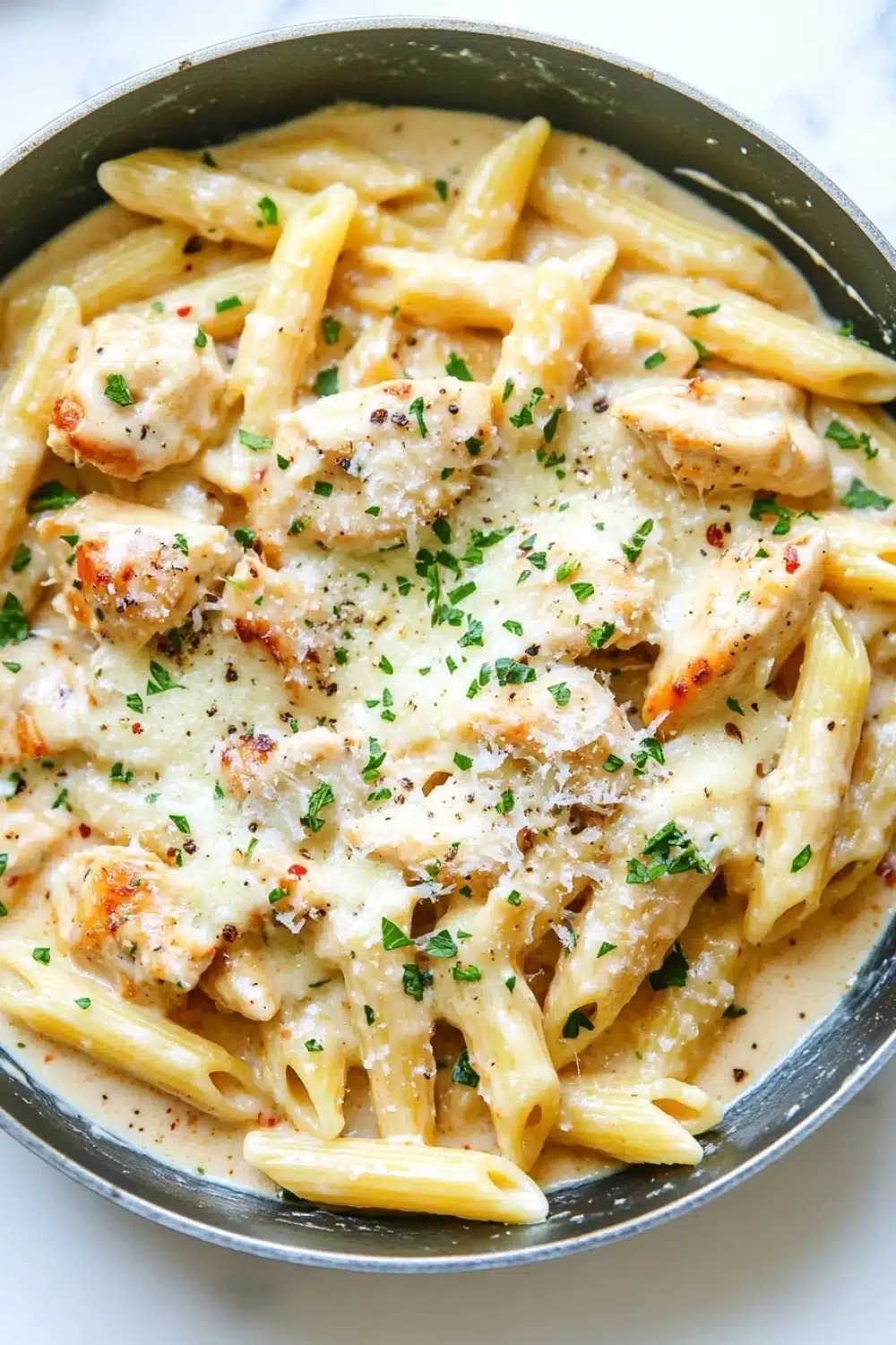 A creamy and flavorful one-pan meal featuring tender chicken, garlic, and pasta tossed in a Parmesan cheese sauce, perfect for a quick and satisfying dinner.