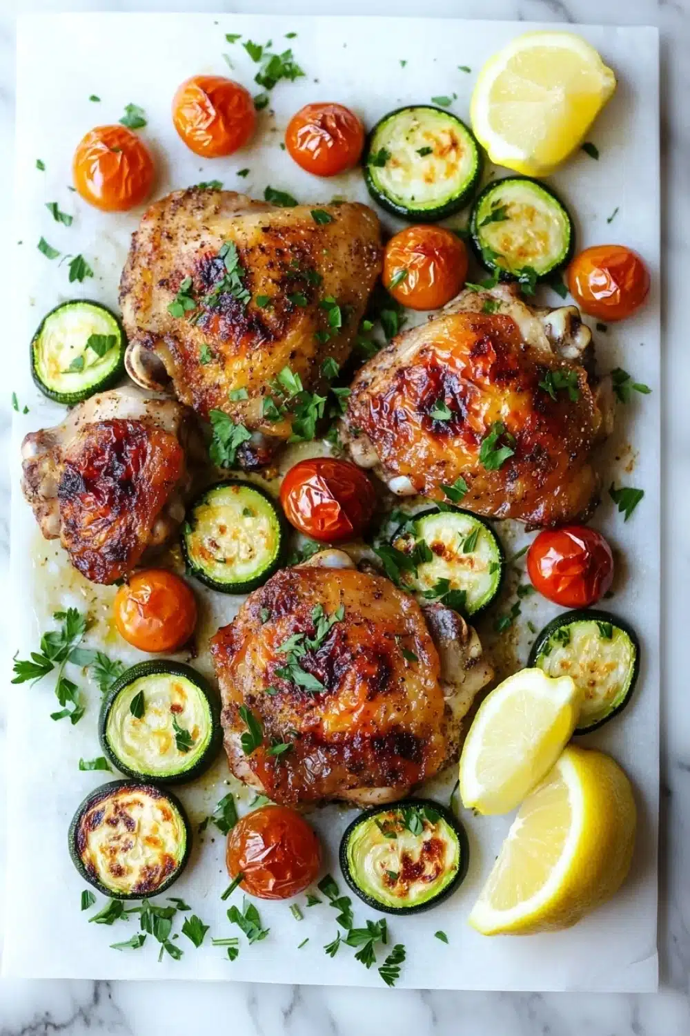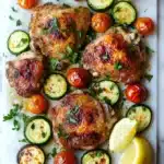 A simple and flavorful sheet pan dinner featuring juicy chicken thighs roasted alongside tender zucchini and cherry tomatoes, seasoned with garlic and Italian herbs for an easy, healthy weeknight meal.