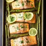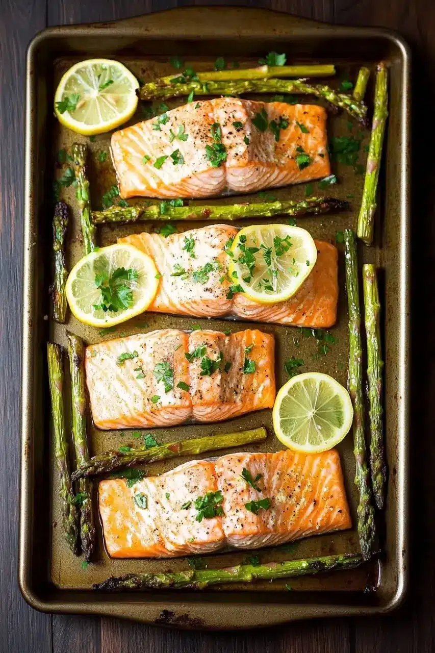 A simple and healthy one-pan meal featuring perfectly roasted salmon fillets and tender asparagus spears, seasoned with lemon and garlic for a fresh, flavorful dinner.