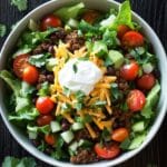 A flavorful and satisfying high protein beef taco salad packed with seasoned ground beef, fresh vegetables, black beans, and a zesty lime dressing. Perfect for a nutritious lunch or dinner.