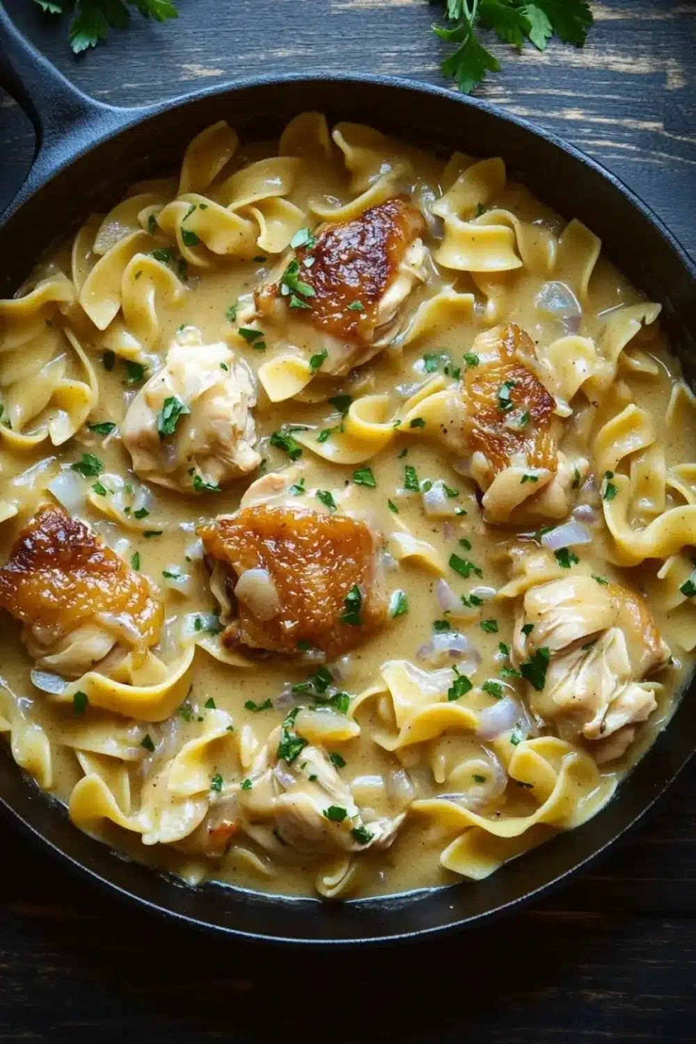 A comforting one-pan meal featuring tender chicken, egg noodles, and a rich homemade gravy, all cooked together in a skillet for an easy and delicious dinner.