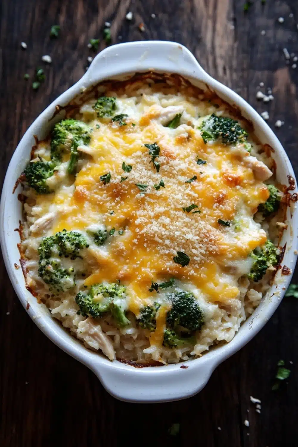 A comforting and hearty casserole combining tender chicken, fresh broccoli, fluffy rice, and a rich cheesy sauce, perfect for an easy family dinner.