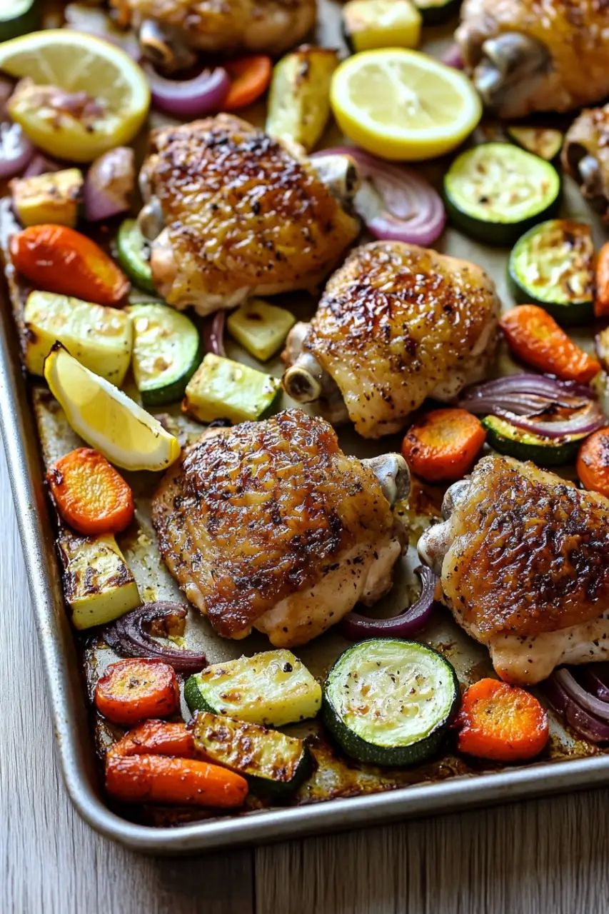 A simple and delicious one-pan meal featuring tender oven-roasted chicken thighs and a medley of seasoned vegetables. Perfect for an easy dinner with minimal cleanup.