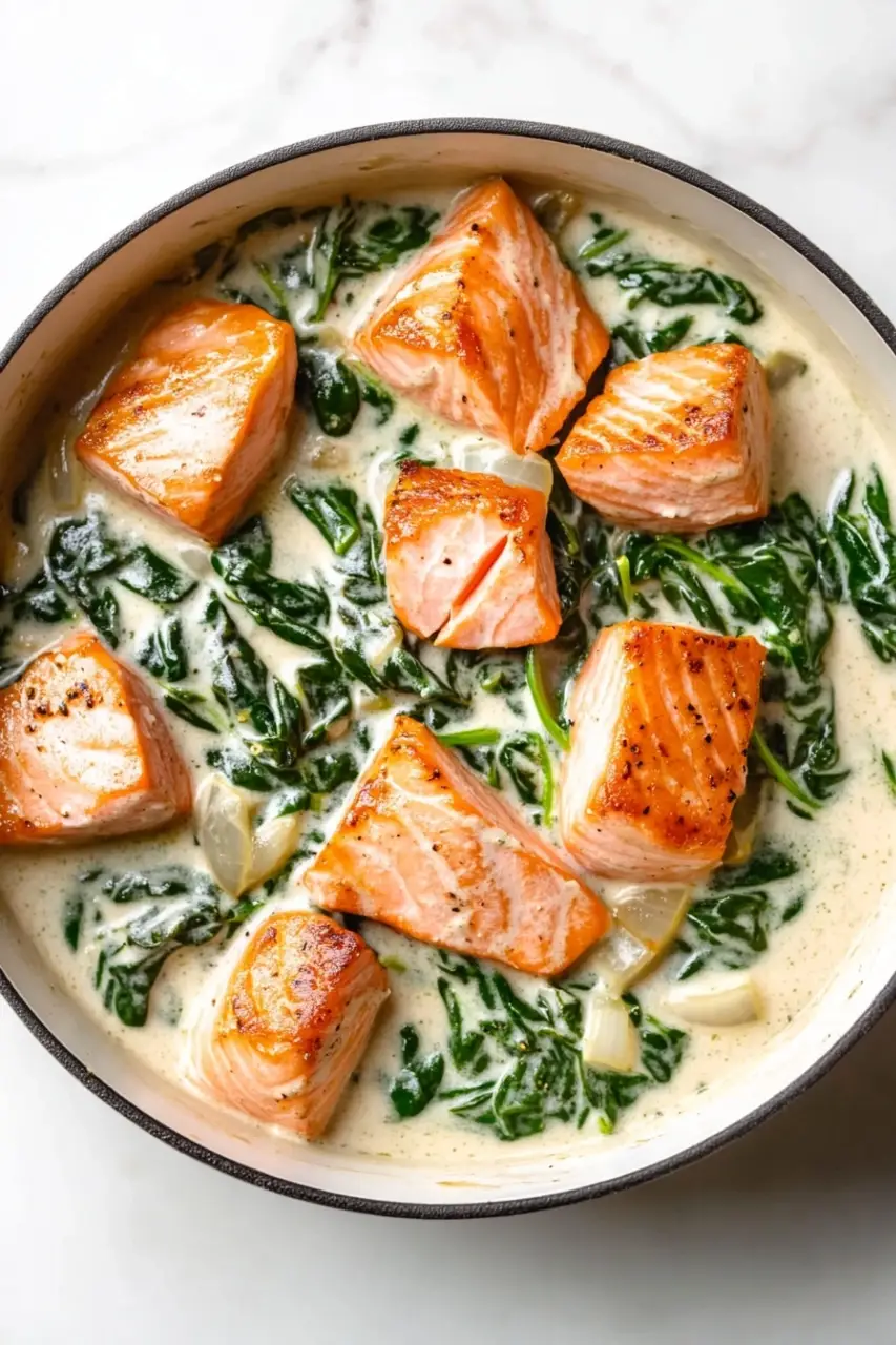 A simple and delicious one-pot meal featuring tender salmon and fresh spinach cooked together with aromatic garlic and onions for a healthy and flavorful dinner.